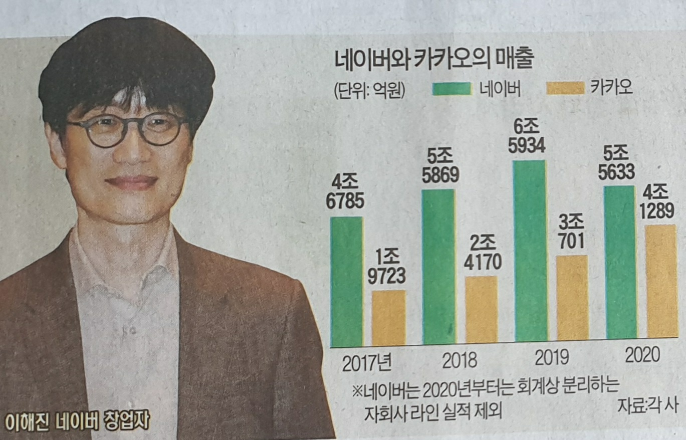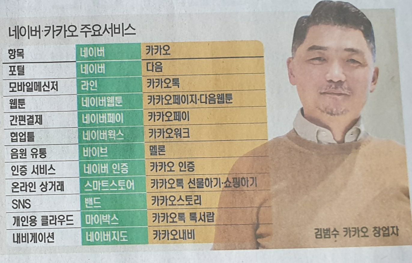 반면 네이버컴은 기술력과 돈은 있었지만 사용자 증가 속도가 더뎠다. 두 기업은 서로의 부족한 부문을 메우기로 했다. 두 회사의 합병으로 탄생한 NHN(현 네이버)은 인터넷 검색과 게임포털이라는 IT 플랫폼에서 국내 1위 사업자로 올랐다. 두 기업 간 경쟁이 ‘국지전’ 성격으로 연기를 피우기 시작한 때는 김 의장이 NHN을 떠나 카카오(당시 아이위랩)를 설립한 2006년이다. 스마트폰 확산을 앞두고 네이버와 카카오는 모바일 메신저라는 또 다른 IT 플랫폼에서 경쟁의 열기가 뜨거워지기 시작했다. 네이버는 네이버톡, 라인 등을 잇따라 내놨지만 카카오톡에 국내 시장을 빼앗겼다. 다만 네이버의 라인은 일본, 대만, 태국 등에서는 ‘국민 메신저’로 불리는 등 해외에서 크게 성공했다.