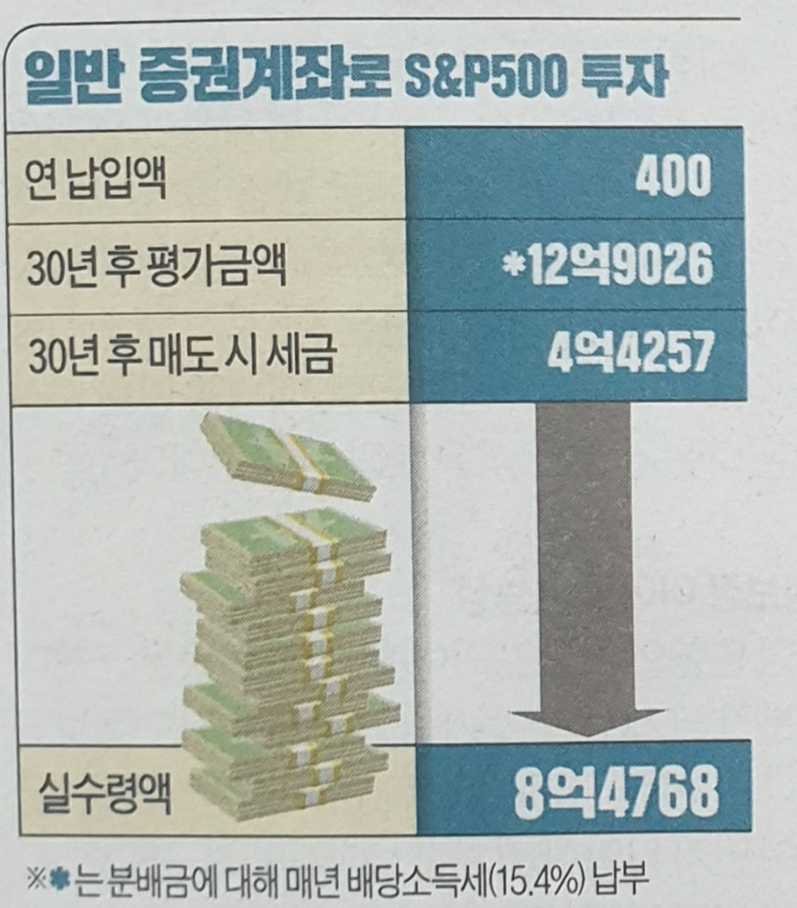 일반 증권계좌로 매년 400만원씩 S&P500 ETF에 투자하면 30년 후 평가금액은 12억9026만원으로 나타났다. 분배금에 대한 배당소득세(15.4%)를 매년 납부한 결과다. 이 ETF를 30년 후 모두 매각할 때는 여기에 더해 4억4257만원의 세금이 부과된다. 결국 투자자가 손에 쥐는 돈은 8억4768만원이다.