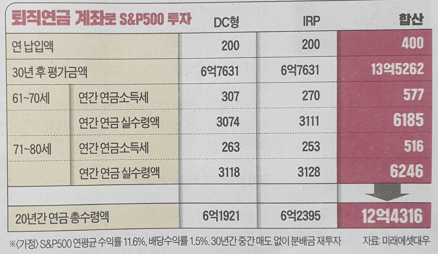 S&P500 ETF의 연평균 수익률은 11.6%로 설정했다. 이달 1일 기준으로 지난 10년 동안의 실제 연평균 수익률이다. 배당수익률 역시 최근 S&P500이 기록하고 있는 1.5%를 적용했다. 퇴직연금 계좌에서 400만원의 투자액 중 200만원은 확정기여(DC)형, 나머지 200만원은 개인형퇴직연금(IRP) 계좌로 투자한다고 가정했다. 크게 확정급여(DB)형, DC형, IRP로 나뉘는 퇴직연금 종류 가운데 자신이 직접 자산을 운용할 수 있는 계좌는 DC형과 IRP라는 점을 고려했다.