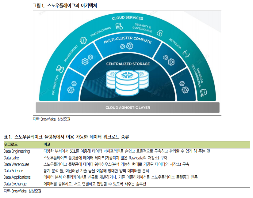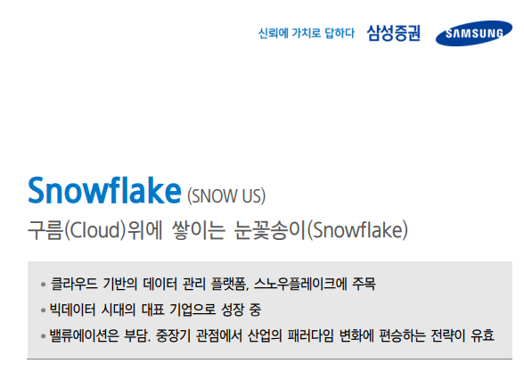 안녕하세요 공부하는 나루입니다. 지난번 클라우드 컴퓨팅 공부에 이어 클라우드 기반의 데이터관리 플랫폼인 스노우플레이크에 대해 지난 2021년 1월 삼성증권에서 발표된 보고서를 바탕으로 공부하겠습니다.