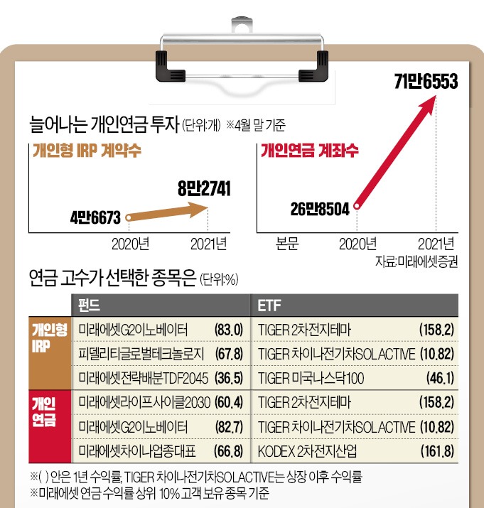 다만 ETF의 경우 2차전지 관련 상품에 쏠린 모습이다. 보유 1~4위 ETF는 TIGER 2차전지테마, TIGER 차이나전기차SOLACTIVE, KODEX 2차전지산업, TIGER KRX2차전지K-뉴딜이었다. 1년 수익률이 199%에 달하는 KODEX WTI원유선물 ETF(10위)도 눈길을 끌었다. 김기영 미래에셋증권 연금솔루션본부장은 “원금보장형을 떠나 실적배당형 상품으로 이동하는 연금 투자자가 나날이 늘어나고 있다”며 “연금 특성상 장기 투자라는 관점에서 보면 방치된 연금 계좌의 수익률과 적극적인 투자자들 간의 격차가 점차 벌어질 경우 노후 자산 양극화가 심해질 수 있다”고 말했다.