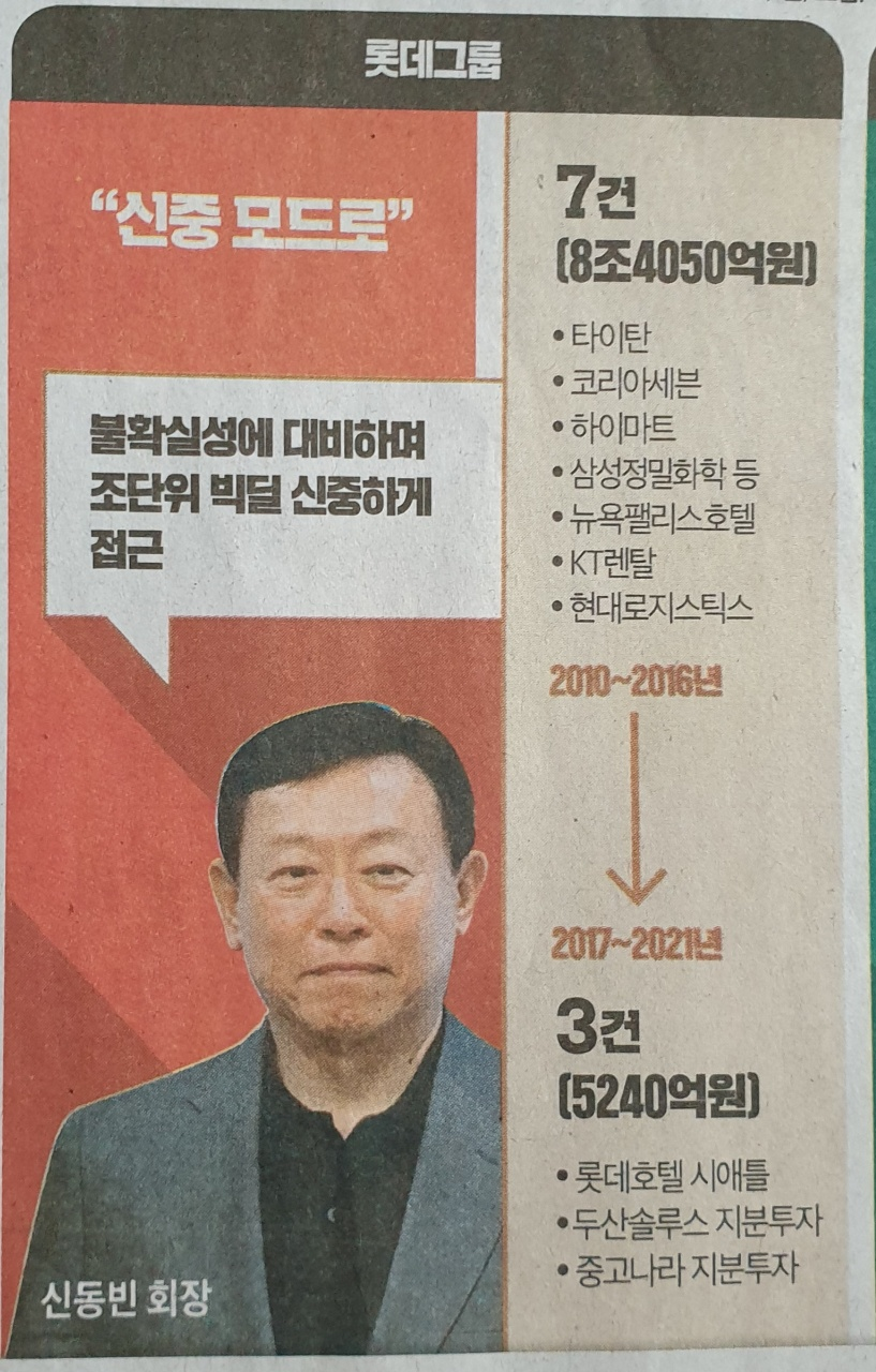 2010년대 들어 수많은 빅딜의 주인공이었던 롯데는 최근 숨고르기에 들어갔다. 올 들어 중고나라 인수에 공동 참여해 300억원을 댔다. 작년에도 두산솔루스를 인수한 사모펀드(PEF) 스카이레이크의 펀드에 핵심 투자자(2900억원 투자)로 나섰다.