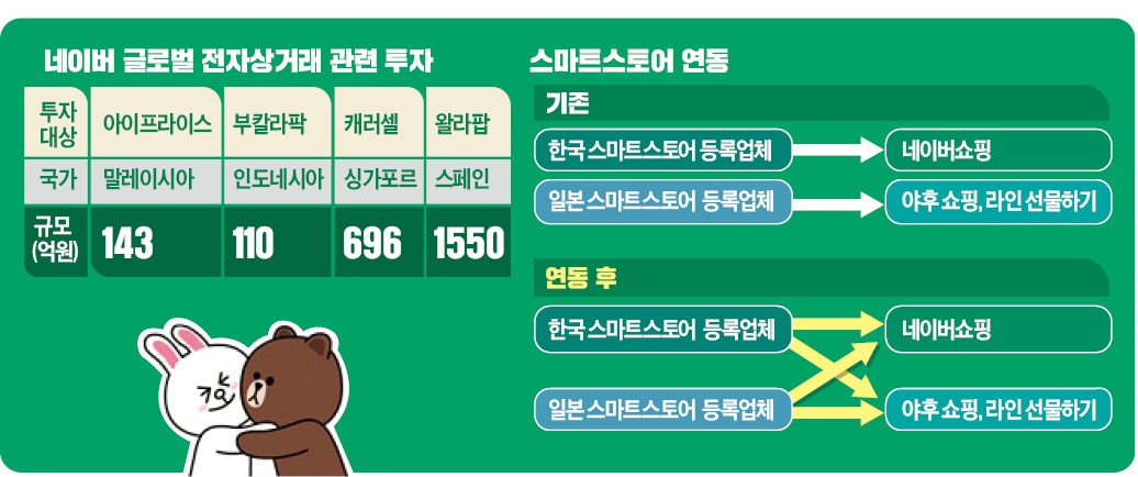 네이버는 이와 동시에 국경과 매장 개념 없이 인터넷으로 물건을 사고팔 수 있는 크로스보더 플랫폼을 이르면 연내 한국과 일본 사이에 구축할 계획이다. 상반기 내 일본에 스마트스토어를 출시하고 라인, 야후 쇼핑 등을 통해 전자상거래 사업을 본격화한다. 한국과 일본 스마트스토어를 이용하는 중소상공인이 상대방 국가 플랫폼에도 판매할 수 있도록 하는 사업이다. 양국 소비자들은 안방에서 편하게 상대국 인기제품을 쇼핑할 수 있게 된다.