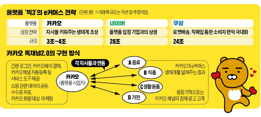 카카오는 쇼핑 외형을 키우기 위해 ‘톡채널’을 통해 기업과 소상공인을 자사 플랫폼 안으로 끌어들이고 있다. 하지만 네이버의 파상 공세에 밀리고 있다. 네이버의 스마트스토어 거래액은 지난해 약 18조원에 달했다. 유통업계 관계자는 “최근엔 네이버가 브랜드 스토어라는 이름으로 대기업을 유치하는 데 적극적”이라고 전했다.