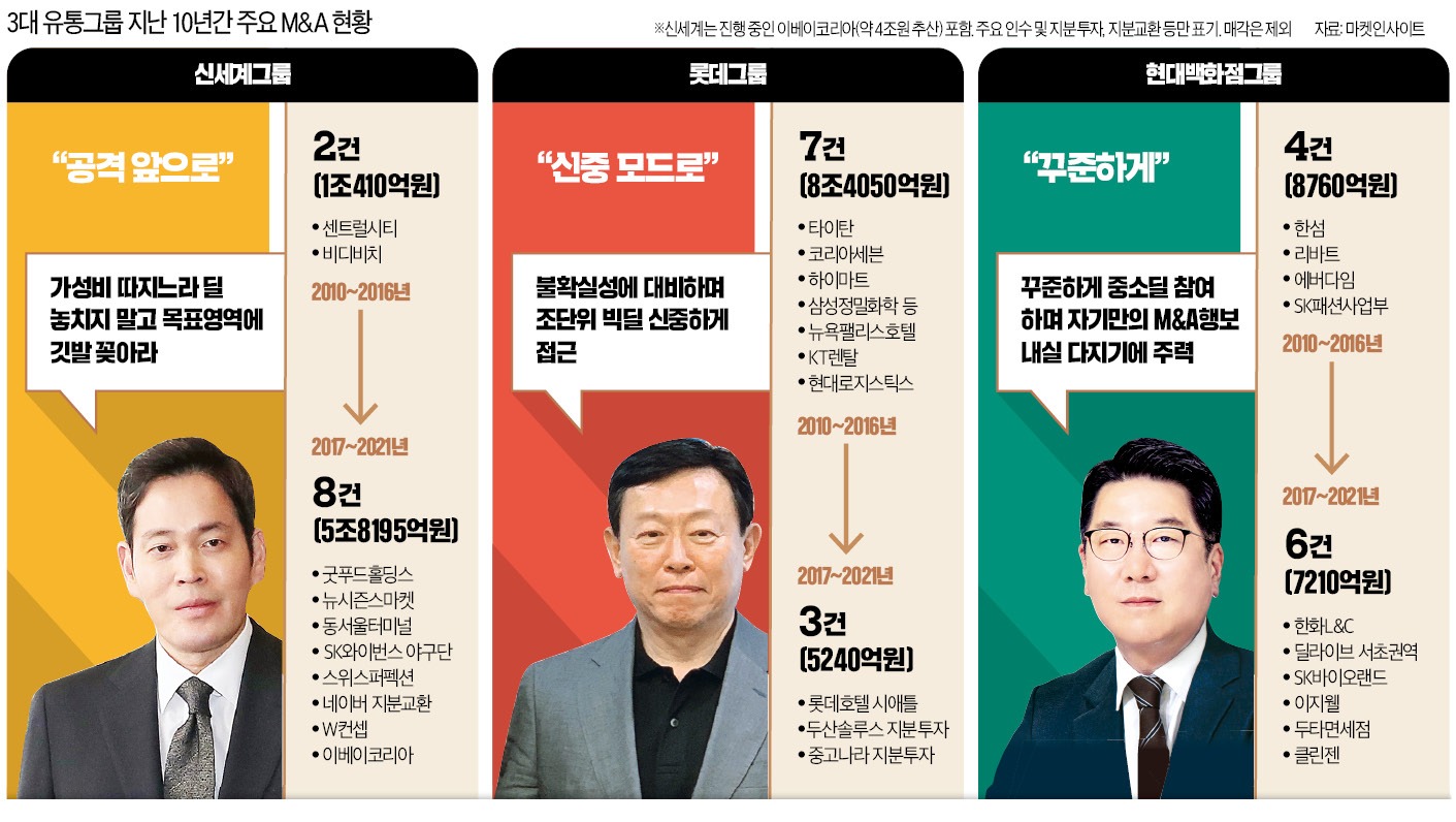 ‘대한민국 유통 명가’ 3인방이 인수합병(M&A) 분야에서 서로 다른 전략을 취하고 있어 눈길을 끌고 있다. ‘왕년의 M&A 대장’이던 롯데는 작년 이후 수비에 중점을 두는 분위기다. 큰 딜에 도전장을 내기는 하지만 신중하게 결정해야 한다는 기조가 강하다. 2010~2016년 7건(8조4050억원)에 달했던 M&A 건수는 2017~2021년 3건(5240억원)으로 확 줄었다.