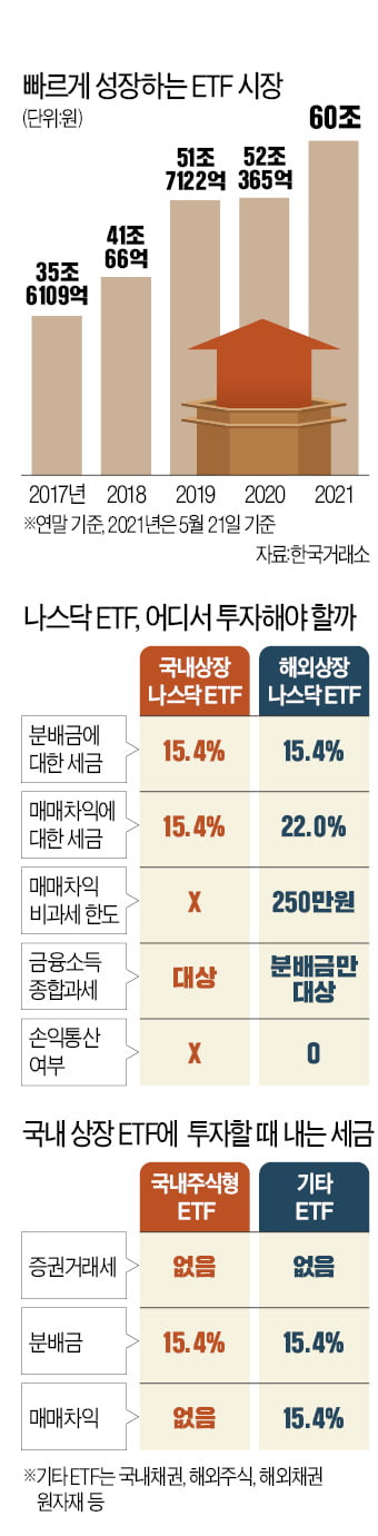 국내 상장 ETF는 국내 주식에 투자하는 ETF를 빼고 매매차익에 대해 15.4%의 배당소득세를 뗀다. 비과세인 국내 주식과 형평성을 맞추기 위해서다. 세율을 단순 비교하면 미국 상장 ETF에 투자하는 게 불리해보이지만 자세히 보면 꼭 그렇지는 않다.