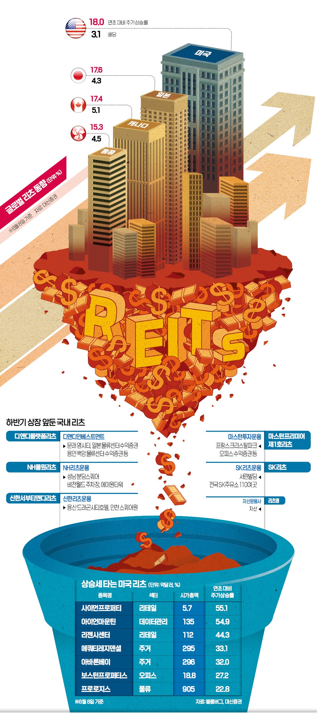 미국 리츠지수는 연초 대비 평균 18% 올랐다. 인프라, 데이터센터와 같은 정보기술(IT) 관련 리츠는 물론 오피스빌딩과 주택 관련 리츠도 대거 상승세다. 올 들어 주가 상승률이 가장 두드러진 종목은 리젠시센터(리테일), 에쿼티레지덴셜(주거), 아바론베이(주거), 아이언 마운틴(정보관리서비스), 프로로지스(물류) 등이다. 배상영 대신증권 연구원은 “소매점 재개장이 7월 본격화하면 리츠의 상승 흐름이 더 이어질 것”이라고 설명했다.