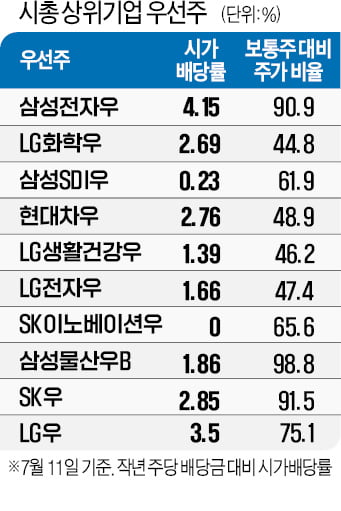 그동안 우선주는 ‘열등한’ 주식으로 인식돼 왔다. 보통주와 달리 의결권이 없기 때문이다. 삼성전자를 제외하고 우선주 주가가 보통주 대비 40~50% 수준에 머물고 있는 이유다. 그렇다고 보통주보다 가치가 낮은 것은 아니다. 의결권이 없어 가격이 낮은 것에 대한 반대급부는 두 배에 가까운 시가 배당률이다. 일반적으로 보통주보다 배당도 더해준다. 회사 청산 시 재산권 청구에서 보통주보다 우선권을 갖는다. 이런 이유로 선진국에서는 보통주보다 우선주 가격이 높은 경우도 많다. 그동안 국내에서 우선주가 저평가된 이유는 기업들이 배당에 인색했기 때문이다. 평균 배당 성향이 15~20% 정도로 선진국(50% 정도)의 절반도 안 됐다. 대기업 오너의 지분율이 낮아 배당을 적극적으로 할 이유가 없었다. 의결권(기업 지배권)을 가진 보통주에 ‘프리미엄’이 부여된 이유다.
