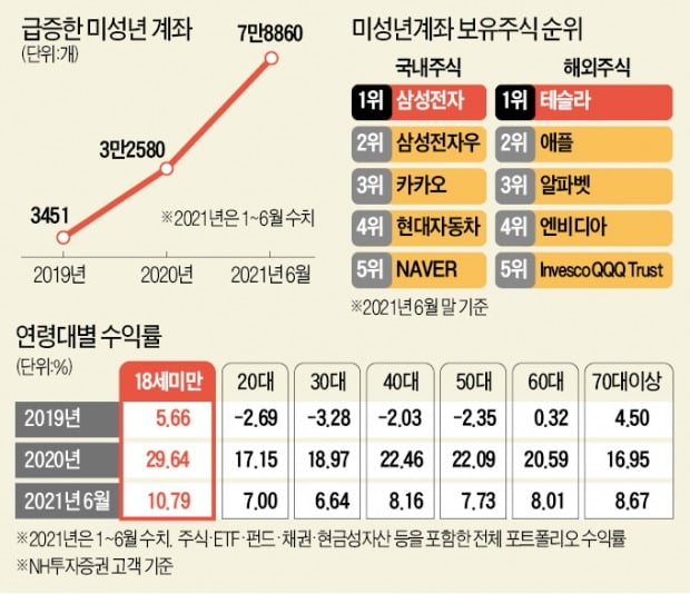 12일 NH투자증권 고객 계좌를 전수 조사한 결과 올 상반기 미성년 계좌는 7만8860개 급증한 것으로 나타났다. 지난 한 해(3만2580개) 동안 생긴 계좌보다 두 배 이상 늘었다. 전체 신규 고객 가운데 차지하는 비중이 1%에 불과했던 미성년 고객 비중은 올 들어 6%까지 증가했다. 60대 이상(5.5%)을 뛰어넘었을 정도로 존재감이 커졌다. 금융감독원에 따르면 지난해 전체 증권사에서 신설된 미성년 계좌는 47만 개. 업계에선 이 같은 추세라면 올해 미성년 계좌 수가 100만 개에 달할 것으로 보고 있다.
