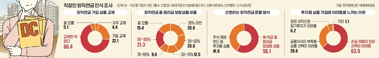 30~50代 직장인 68% "퇴직연금 상품 바꾼 적 없다", 한경·미래에셋, 퇴직연금 설문 58% "손실위험 탓 예·적금 선호" 20% "DB형·DC형 구분 못해" 전문가 "ETF 등 투자땐 리스크↓"
