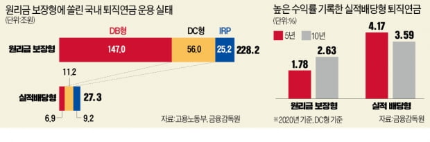 IRP도 상황은 다르지 않다. 금감원이 발표한 ‘퇴직연금 적립금 운용 현황’을 보면 2016~2020년 5년간 개인형 IRP의 연평균 수익률은 1.92%였다. 수탁액의 70% 이상을 차지하는 원리금보장형 상품 수익률은 1.32%에 불과했다. 실적배당형 상품인 펀드 등의 수익률은 상대적으로 높은 3.89%였다.
