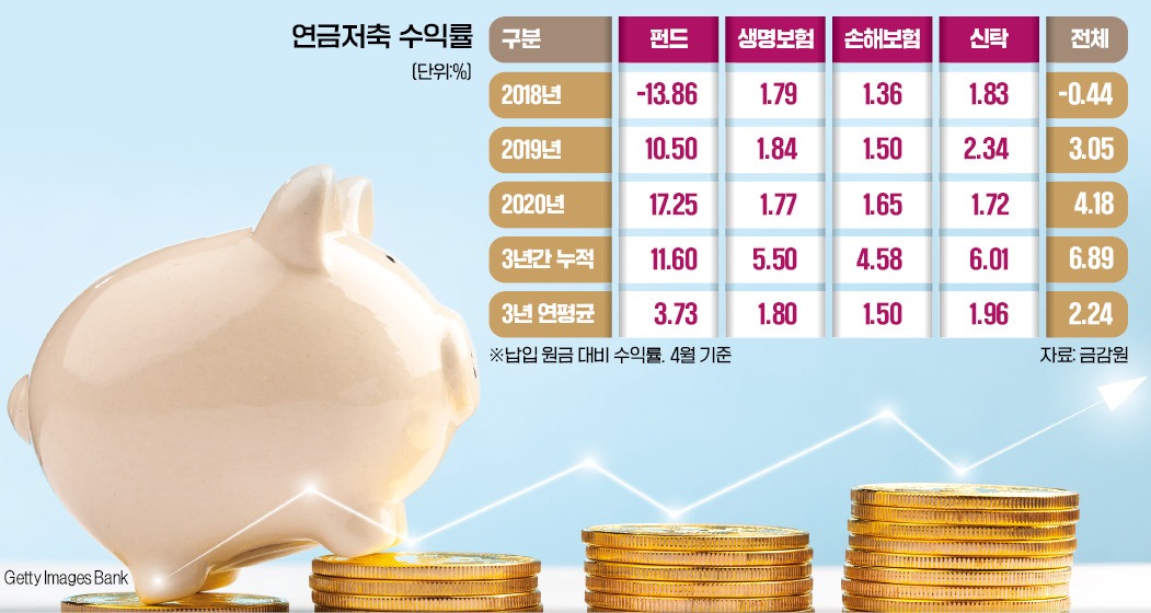 둘째는 낮은 수익률이다. 세액공제에만 신경 쓰다 보니 저금리에도 대부분 원리금보장형 상품에 머물러 있다. 2018~2020년 3년간 연금저축의 연평균 수익률은 2.24%였다. 세부적으로 살펴보면 연금저축 적립금의 70% 이상을 차지하는 연금저축보험 수익률은 1%대에 불과했다. 지금은 판매되지 않고 있는 은행의 연금저축신탁도 수익률은 비슷했다. 실적배당상품인 연금저축펀드만 홀로 3.73%의 수익률을 기록 중이다.