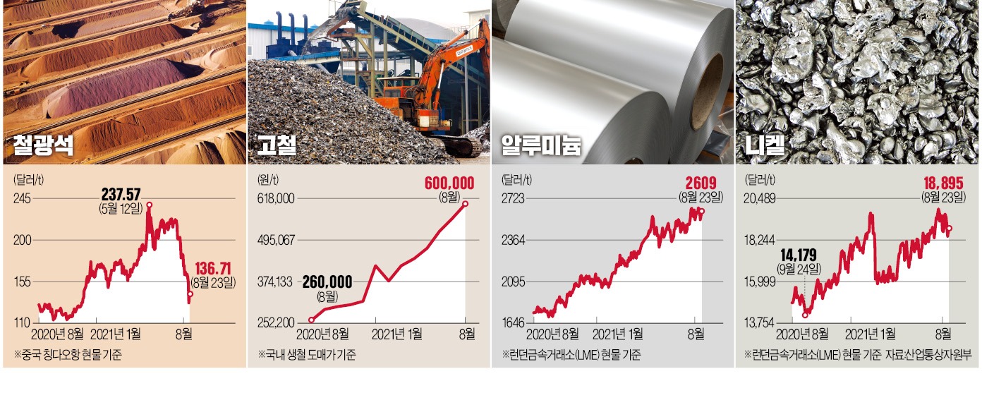 최근 원자재 시장 변동은 철강산업에서 촉발되고 있다는 분석이다. 철강 생산의 원료인 철광석과 고철 가격이 따로 움직이는 ‘디커플링(탈동조화)’이라는 이례적 현상까지 나타나고 있다. 한 달 전까지 t당 220~230달러 수준이던 철광석 가격은 최근 130~140달러 선으로 떨어지며 역대 최대 단기 낙폭을 보였다. 반면 고철 가격은 t당 60만원대를 돌파하며 1년 전에 비해 두 배 이상 상승했다.