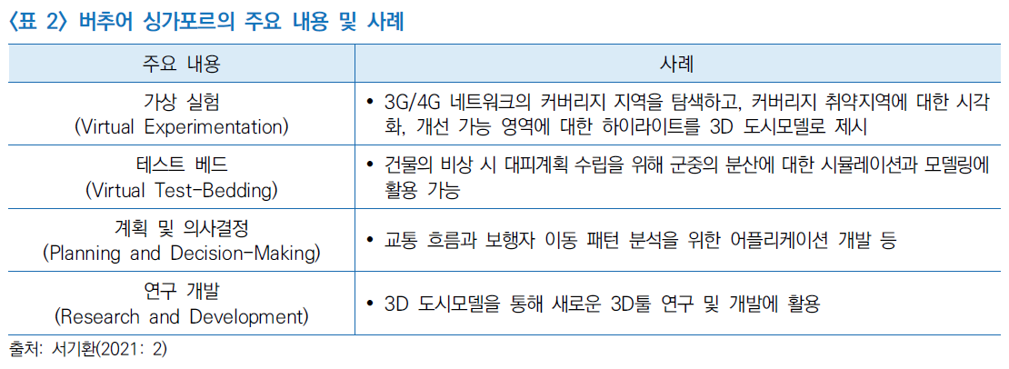 □ 버추얼 싱가포르는 3차원 도시 모델을 이용해 도시계획을 지원하는 등 가상 도시를 실험실 또는 새로운 서비스를 위한 테스트베드로 활용하거나, 도시 및 교통계획을 위한 의사결정 지원과 연구자를 위한 연구개발 환경지원 등 4가지 주요 기능을 제공