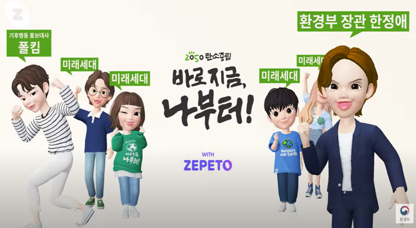 □ 제페토 참여자에게 무료로 증정되었던 지구의 날 탄소중립 품목을 장착한 익숙한 캐릭터들이 등장하여 기후행동을 쉽게 설명