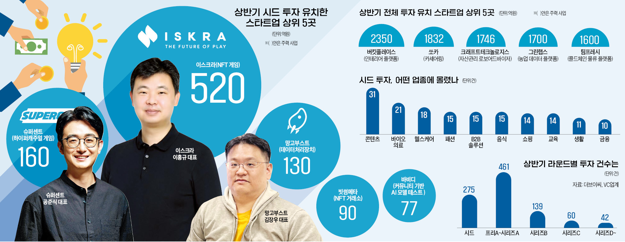 지난 상반기 시드 투자 유치로 100억원대 자금을 끌어모은 스타트업 세 곳이 있다. 망고부스트와 이스크라, 슈퍼센트가 주인공이다. 시드 투자 유치는 설립 단계에 있는 기업이 자금을 끌어모으는 것을 말한다. 아직 본격적인 사업 채비를 갖추기도 전에 벤처캐피털(VC)과 대기업 등이 앞다퉈 “자금을 대겠다”며 돈 보따리를 들고 찾아온 것이다.