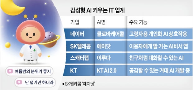 감성형 AI 개발 움직임도 잇따르고 있다. 네이버는 3분기에 중장년 1인 가구를 위한 돌봄형 AI 콜서비스 ‘클로바 케어콜’에 지속적 대화 기능을 더할 예정이다. 과거에 AI와 사용자가 주고받은 내용 중 주요 정보를 추출해 기억하고, 이를 다음 대화에 활용하도록 한다는 구상이다. 이를 통하면 이용자에게 AI가 “그때 말씀하신 병원엔 잘 다녀오셨어요?” 등을 질문해 개인화 건강 관리 도우미 역할도 할 수 있다. KT도 연내 공감 지향 초대형 AI 모델인 ‘KT AI 2.0’을 개발해 공개할 계획이다.