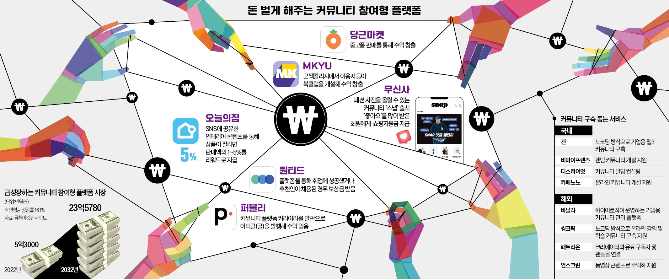 커뮤니티 참여형 플랫폼이 진화하고 있다. 일반적으로 커뮤니티는 재미·정보·취향을 공유하는 사람들이 모이고 관련 콘텐츠가 만들어진 뒤 전자상거래 플랫폼으로 확장한다. 무신사, 오늘의집, 당근마켓, MKYU 등 성공 플랫폼 모두 그랬다.