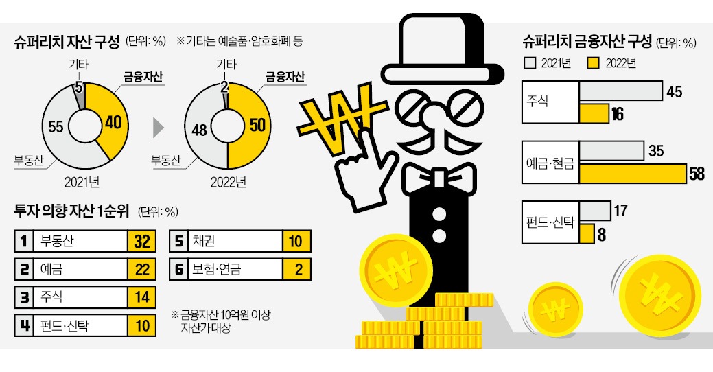 국내 초고액 자산가(슈퍼 리치)의 평균 총자산은 323억원에 달하고 금융자산의 60%를 현금 및 예금으로 보유하고 있는 것으로 나타났다. 이들은 지난 1년간 현금·예금 등 안전자산 비중을 늘리고 위험자산 비중은 줄였다. 올해 유망 투자처로는 주식과 부동산을 꼽았다.