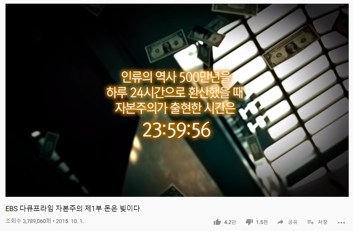 1) 유튜브, EBS Documentary, EBS 다큐프라임 자본주의 제1부 돈은 빚이다