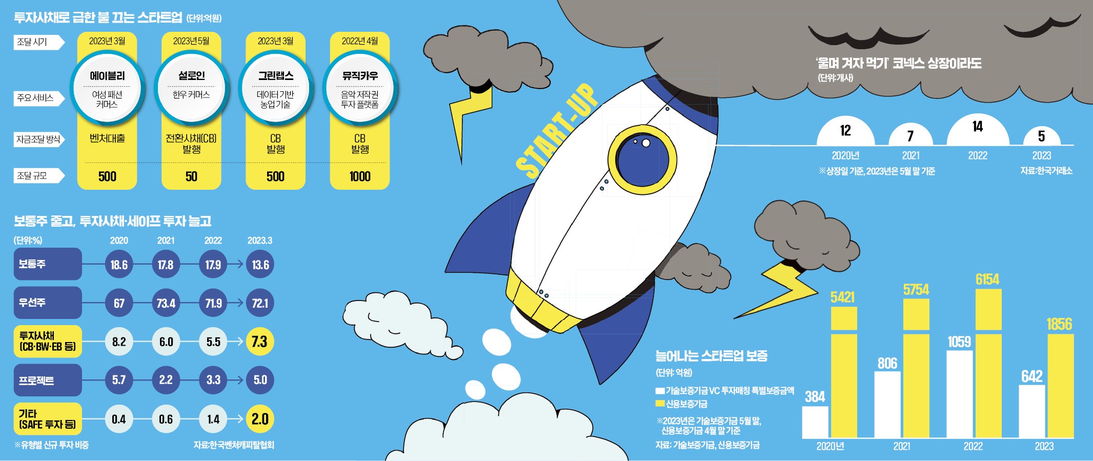 혹한기 생존을 위해 융자를 선택하는 벤처·스타트업도 많아졌다. 기술보증기금과 신용보증기금의 보증을 통해 은행 대출을 받는 경우다. 벤처 투자를 유치한 스타트업에 비슷한 규모로 최대 50억원의 보증을 지원하는 기보의 ‘VC 투자 매치 특별보증’을 받은 회사는 2021년 49곳에서 지난해 62곳으로 증가했다. 보증 금액도 806억원에서 1059억원으로 늘었다. 올해는 더 많은 벤처기업이 몰렸다. 5월 말 기준 42개 기업이 642억원 규모 융자 보증을 받았다.