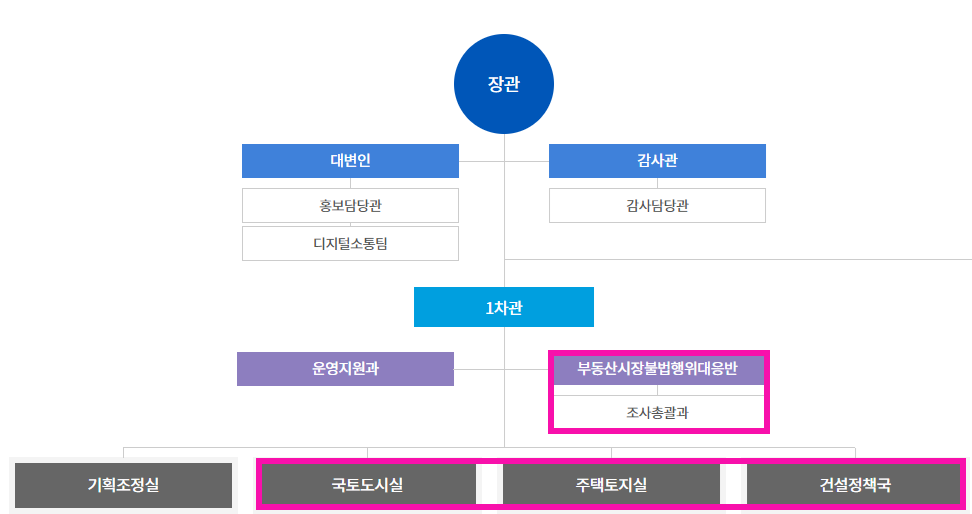 조직도를 보면 그 기관의 중요도를 확인할 수 있습니다. 국토부는 예상한 대로 아주 큰 조직이었습니다. 1차관과 2차관으로 나뉘는데, 저는 1차관 산하 '부동산시장불법행위대응반'과 아래 '국토도시실, 주택토지실, 건설정책국'에 시선이 갔습니다. '국토 → 토지 → 땅 → 부동산' 이렇게 볼 수 있지 않을까요? 조심스레 사견을 더하면 부동산 문제 해결이 국토교통부의 주요 과제 인듯 합니다.