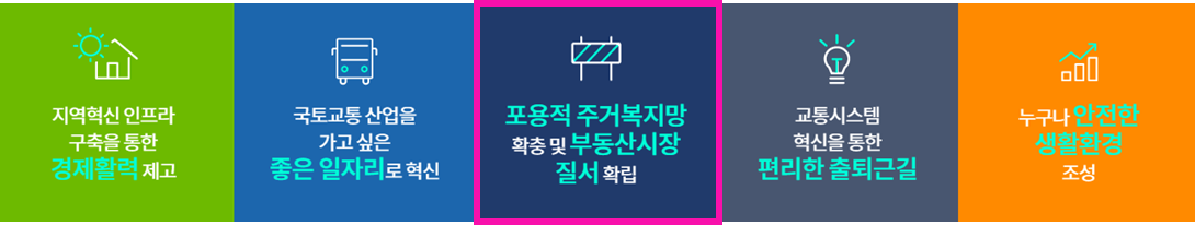 국토교통부의 2020 업무계획 보고에 따르면 ① 혁신인프라 구축을통한 경제활력 제고, ② 국토교통산업을 가고 싶은 좋은 일자리로 혁신, ③ 포용적 주거복지망 확충 및 부동산 시장 질서 확립, ④ 교통시스템 혁신을 통한 편리한 출퇴근길, ⑤ 누구나 안전한 생활환경 조성 등 5개의 '핵심추진과제'가 있었습니다. 모든 주제가 흥미 있어 보이지만, 오늘은 ③번만 살펴보도록 하겠습니다.