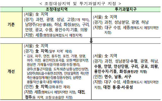 서울은 당연히 전 지역이 투기과열지구이고요, 이번 발표는 경기, 인천, 대전, 청주 중 일부 지역을 제외한 전 지역을 조정대상지역으로 지정했습니다.