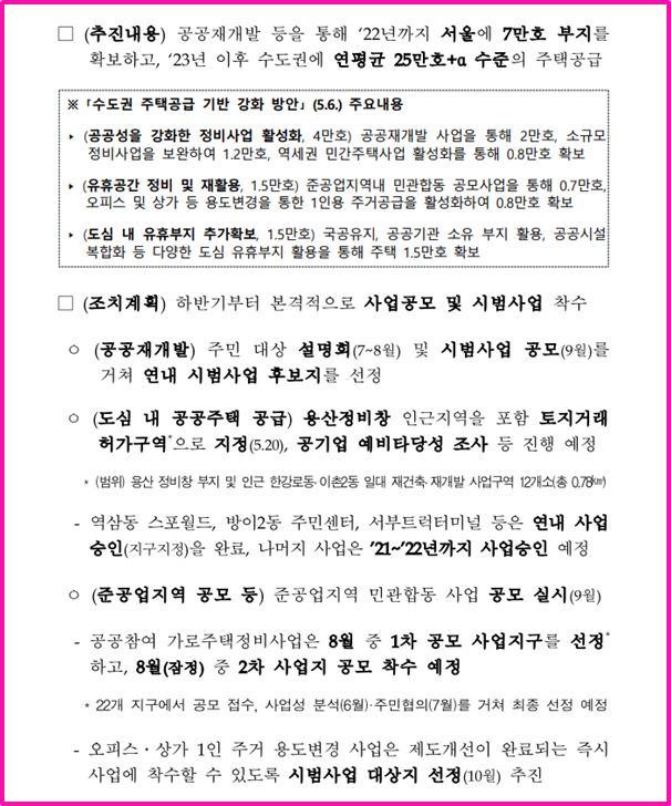 마지막으로 '수도권 주택공급 기반 강화 방안(5.6)' 후속 조치 이행 부분을 보니, 서울을 비롯한 수도권에 대규모 주택이 공급될 것 같습니다. 해당 부분은 추후에 관심을 가지고 정리를 해야겠습니다.