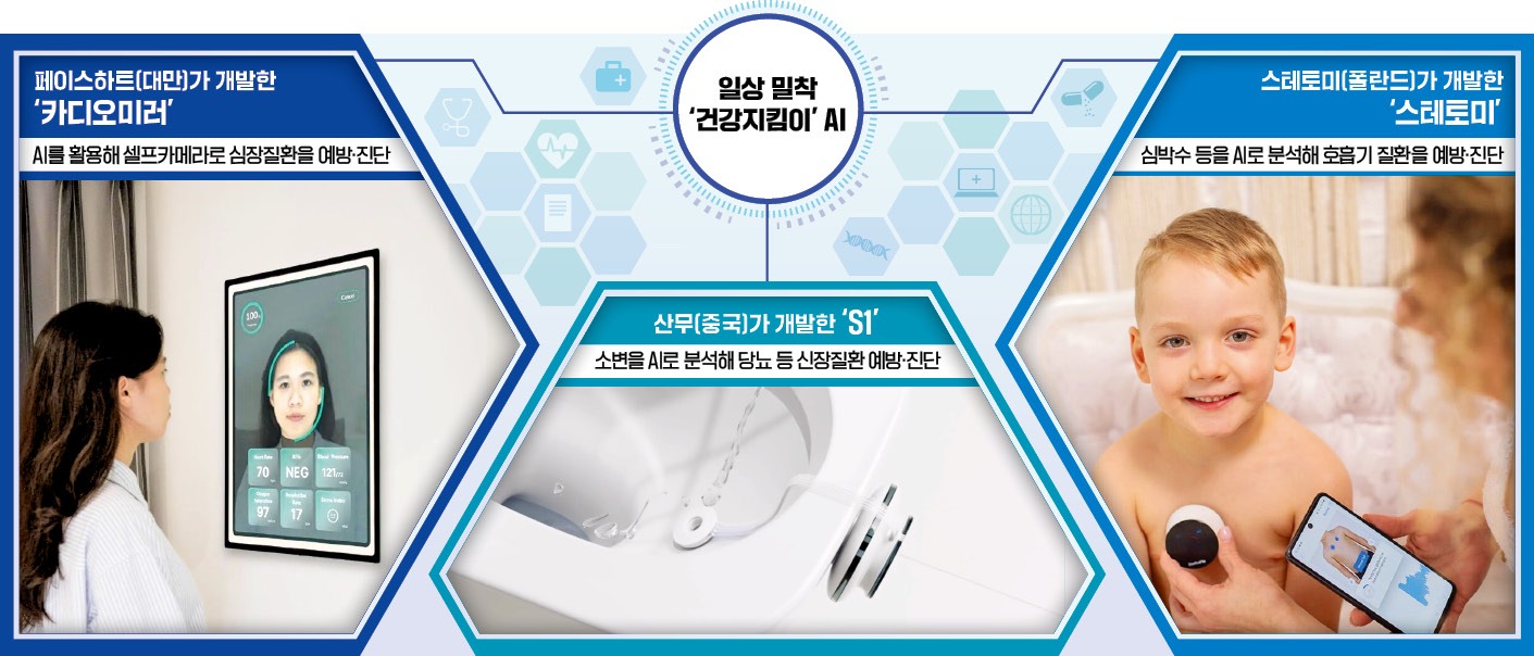 중국 스타트업 산무는 당뇨를 매일 추적 관찰할 수 있는 AI 로봇 ‘S1’을 CES 2025에 내놓는다. 양변기에 부착한 S1에 소변이 닿으면 10분 안에 신장 질환과 관련한 10개 지표가 스마트폰에 뜬다. AI를 기반으로 개발한 디지털 마이크로 유체 기술이 소변 성분을 순식간에 분석해낸다. 미국 덱스콤은 연속혈당측정기(CGM)에 AI를 결합해 단순한 혈당 측정을 넘어 그때그때 생활습관을 관리해주는 솔루션을 공개한다. ‘혈당이 갑자기 높아졌으니 음식 섭취를 중단하고 산책을 하라’는 식이다.