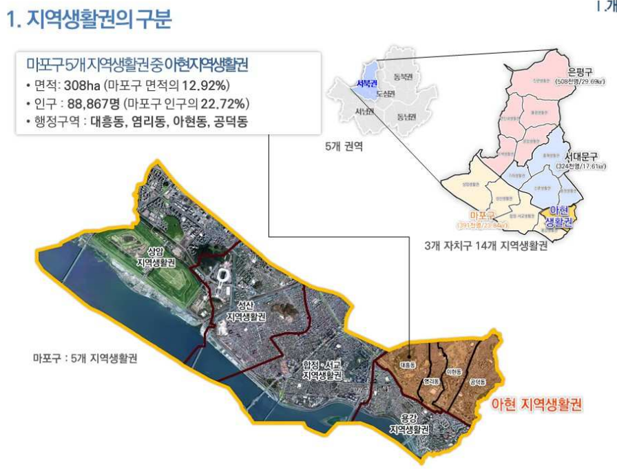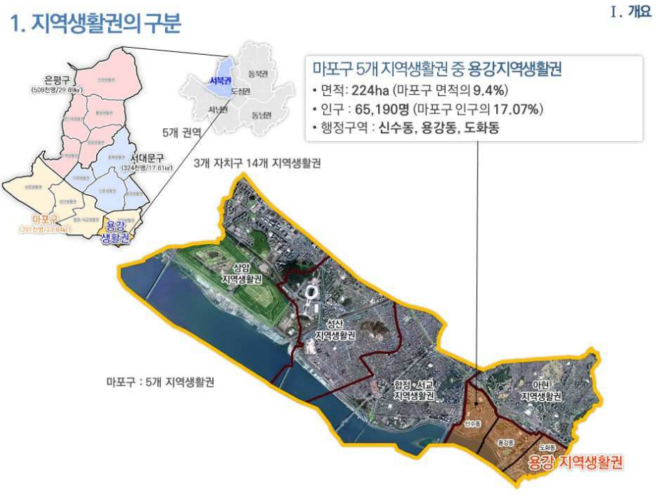 [지역생활권] 상암 지역생활권, 아현 지역생활권,용강 지역생활권, 합정·서교 지역생활권, 성산 지역생활권으로 구분됨