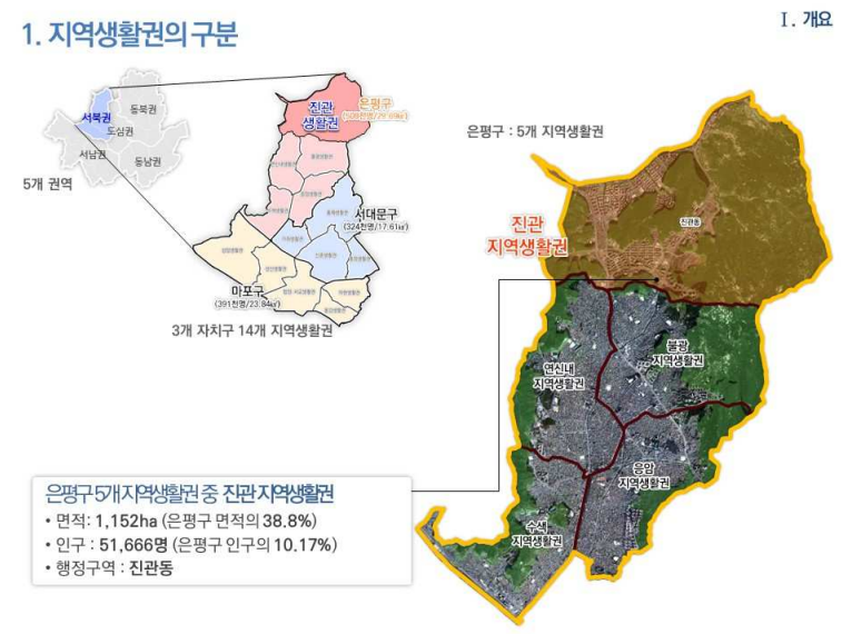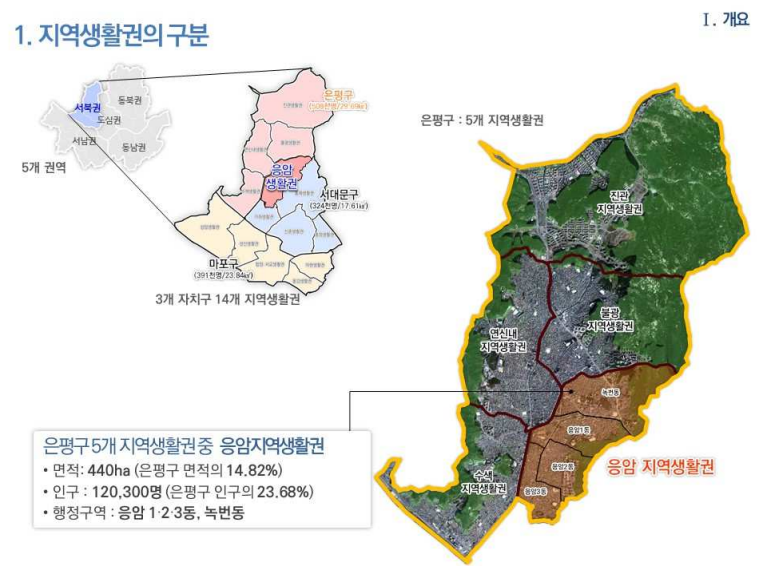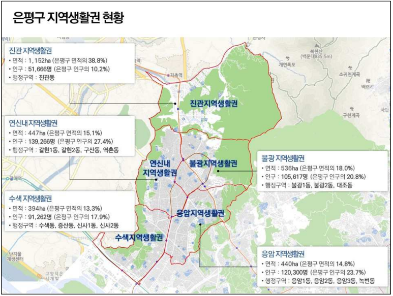 [은평구 지역생활권 현황] 진관 지역생활권, 연신내 지역생활권, 수색 지역생활권, 불광 지역생활권, 응암 지역생활권으로 나뉨