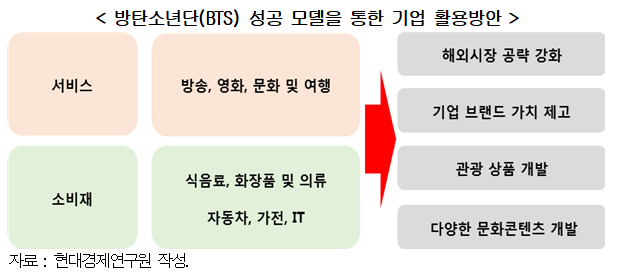 - BTS의 성공은 국내 기업에게 해외시장 공략, 브랜드 가치제고, 관광상품 및 문화콘텐츠 개발에 있어 사업적 기회를 제공할 것으로 예상