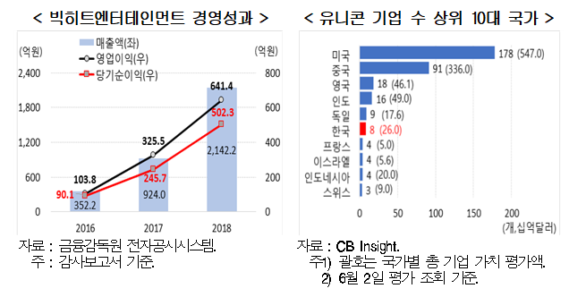 - 유니콘(Unicorn) 기업으로 한국기업의 성장은 미비한 상황이나, BTS 성공으로 소속 기획사인 빅히트엔터테인먼트 기업가치는 유니콘 기업 수준까지 상승