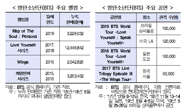 - BTS는 멤버 본인들의 이야기 등을 담은 27개의 앨범을 국내외 발표하였고, 전 세계 18개국 이상에서 140여 회 공연을 진행(2019.6 보고서 발표일자 기준)