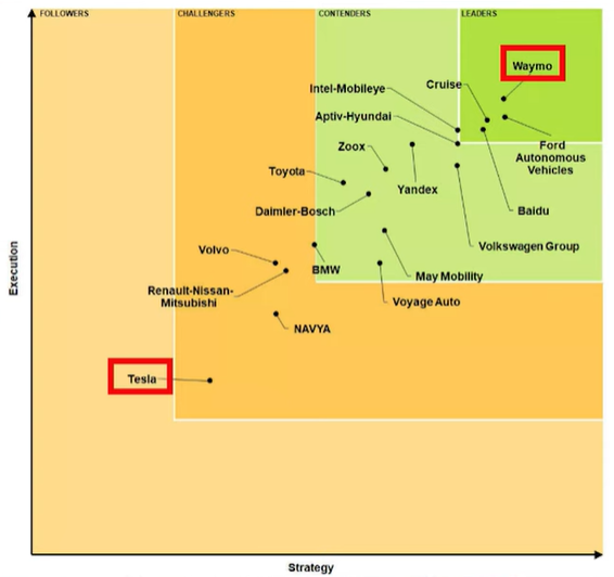 웨이모는 우리가 잘 아는 차에 자율주행기능을 넣어 다양한 데이터를 모으고 있는 중 , 지난 3월에 웨이모 성능을 보여준 결과 있는데 성능이 가장 좋은 것으로 나옴