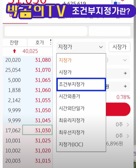 4. 주건부지정가 : 당일 원하는 가격대에 사려고 지정했으나, 그 가격으로 살 수 없을 경우 시장가로 매수