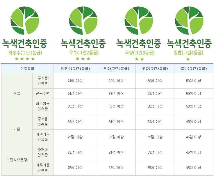 인증 대상은 신축(사용승인 또는 사용검사를 받은 후 3년 이내의 모든 건축물), 기준(공동주택, 업무역 건축물)이며, 인증 의무 대상은 공공기관에서 발주하는 연면적 3,000㎡ 이상 건축물입니다. 인증등급은 최우수(그린1등급), 우수(그린 2등급), 우량(그린 3등급), 일반(그린 4등급)으로 구성됩니다.